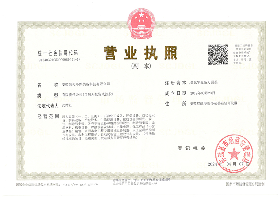 - 安徽恒天環(huán)保裝備科技有限公司(Anhui Hengtian Environmental Equipment Technology Co.,Ltd.)-壓力容器、環(huán)保設(shè)備專業(yè)制造公司,擁有成熟的反應(yīng)釜、換熱器、分離、塔器及各式大型儲罐等壓力容...